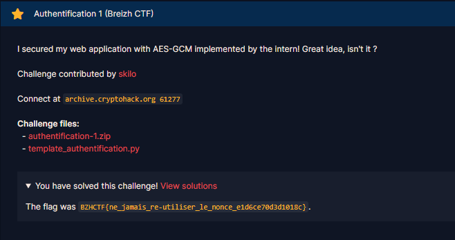 My write-up for the BreizhCTF 2025 medium crypto challenge AutHentification 1, where I analyzed an AES-GCM misuse (fixed key/nonce and missing tag verification), treated it like a reusable stream cipher, recovered the keystream from a controllable user cookie, and forged a super_admin cookie to obtain the flag