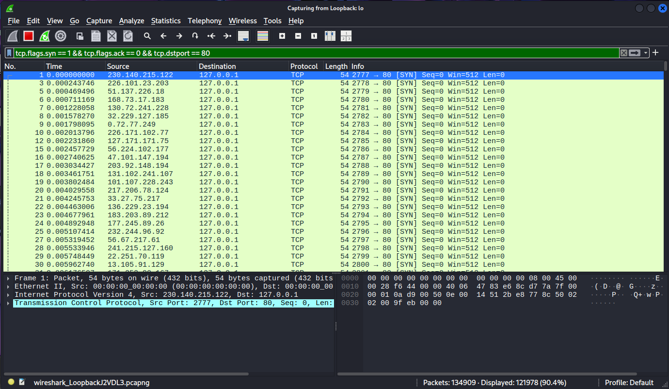 lo/eth0và lọc đúng SYN bằng biểu thứctcp.flags.syn == 1 && tcp.flags.ack == 0 && tcp.dstport == 80. - Kết quả capture cho thấy nhiều gói SYN từ IP nguồn ngẫu nhiên đổ về victim, đúng đặc trưng của SYN Flood.